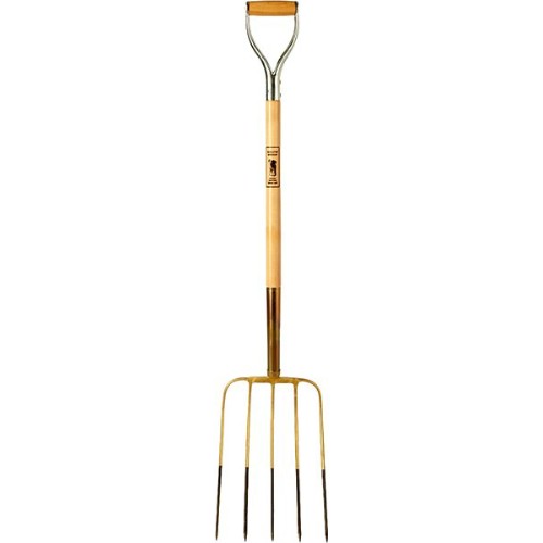 Gödselgrep med 5 runda klor, valsade och härdade av specialstål. Skaft med rörbeslag och y-handtag.